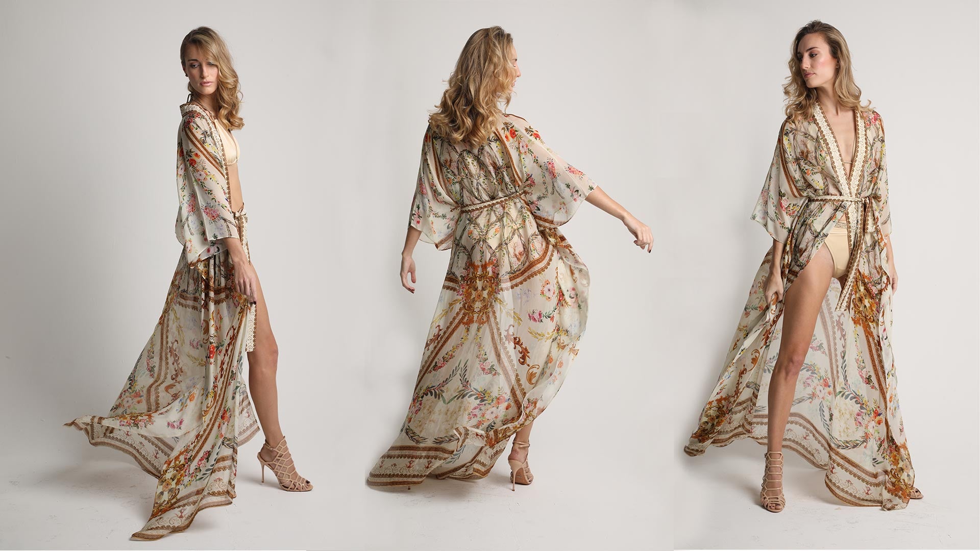 Seduction has never been so easy. Adorn yourself in our gorgeous full length, lightweight cream color robe, perfect for lounging at home or pool or beach, paired with our camisole and wide leg trousers for a complete look, or thrown over your favorite bikini for instant sophistication with a bohemian flair. Our custom print, combining floral and elegant chain link detail, is polished with a 100% Swarovski lapel, and detachable belt. An essential for sunny vacations or pool parties. Cream silk robe with floral print and crystal embellishment details. Swarovski crystals on collar & detachable belt.