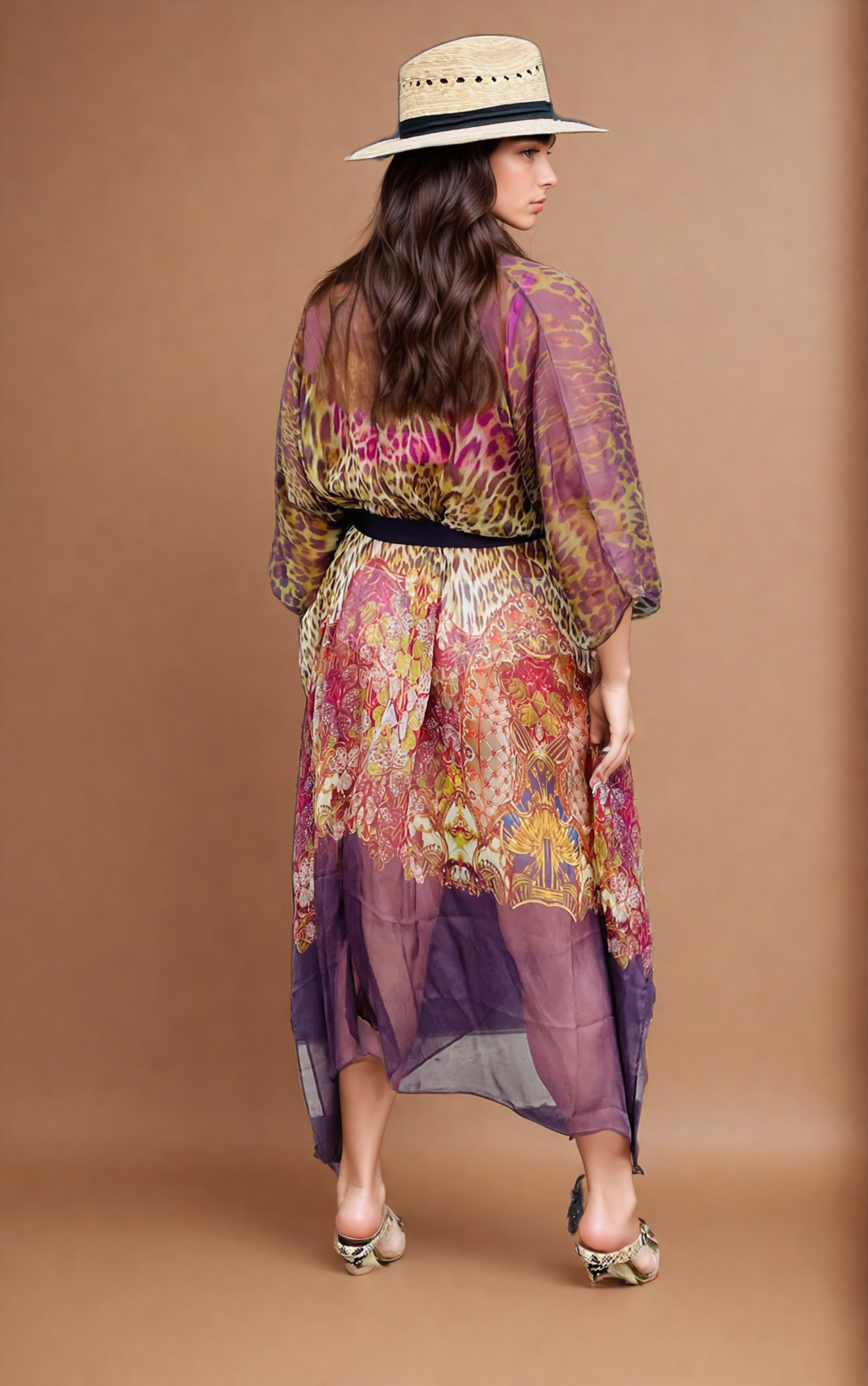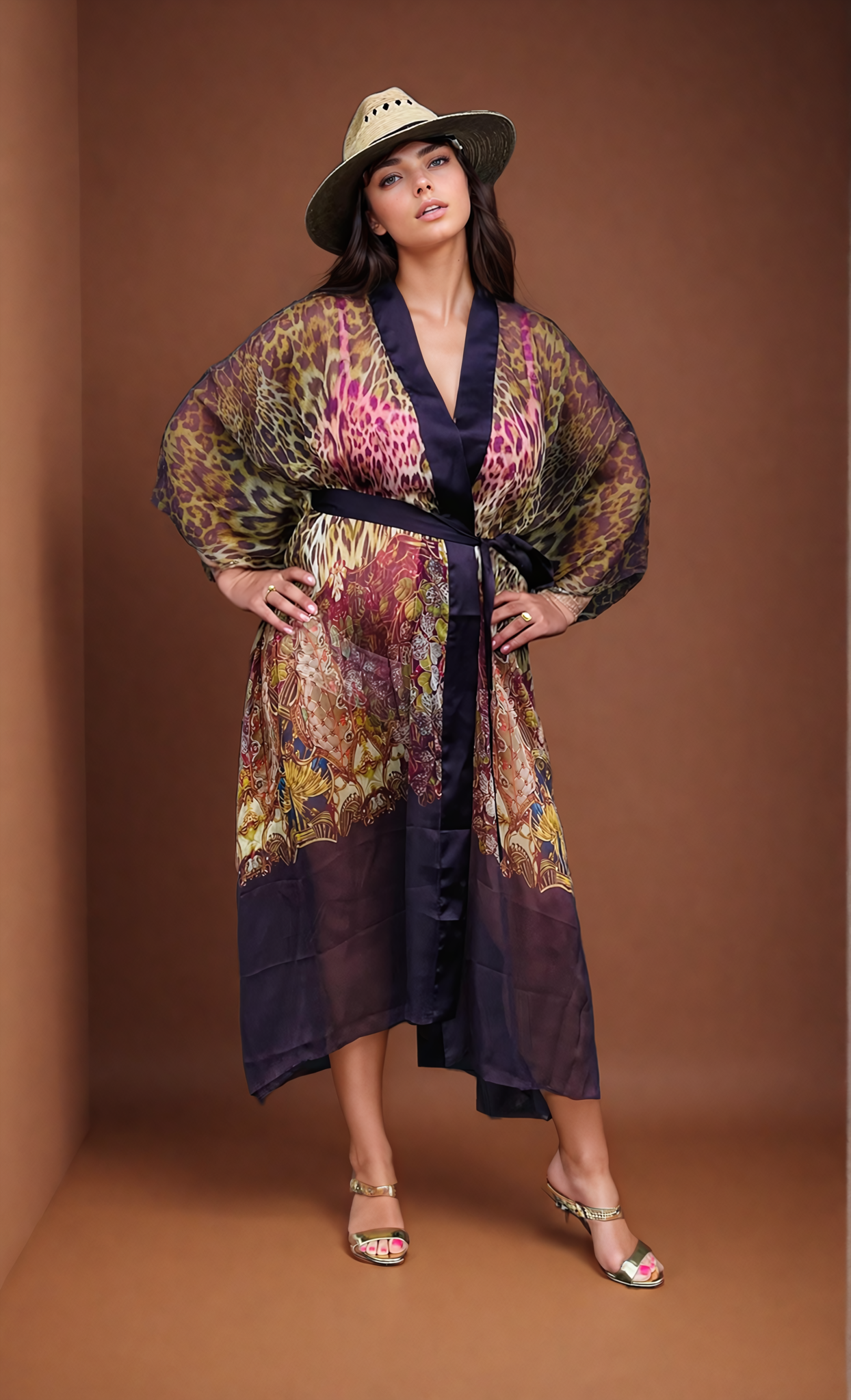 An essential for sunny vacations or pool parties. Animal print silk robe, wrapped in luxury.