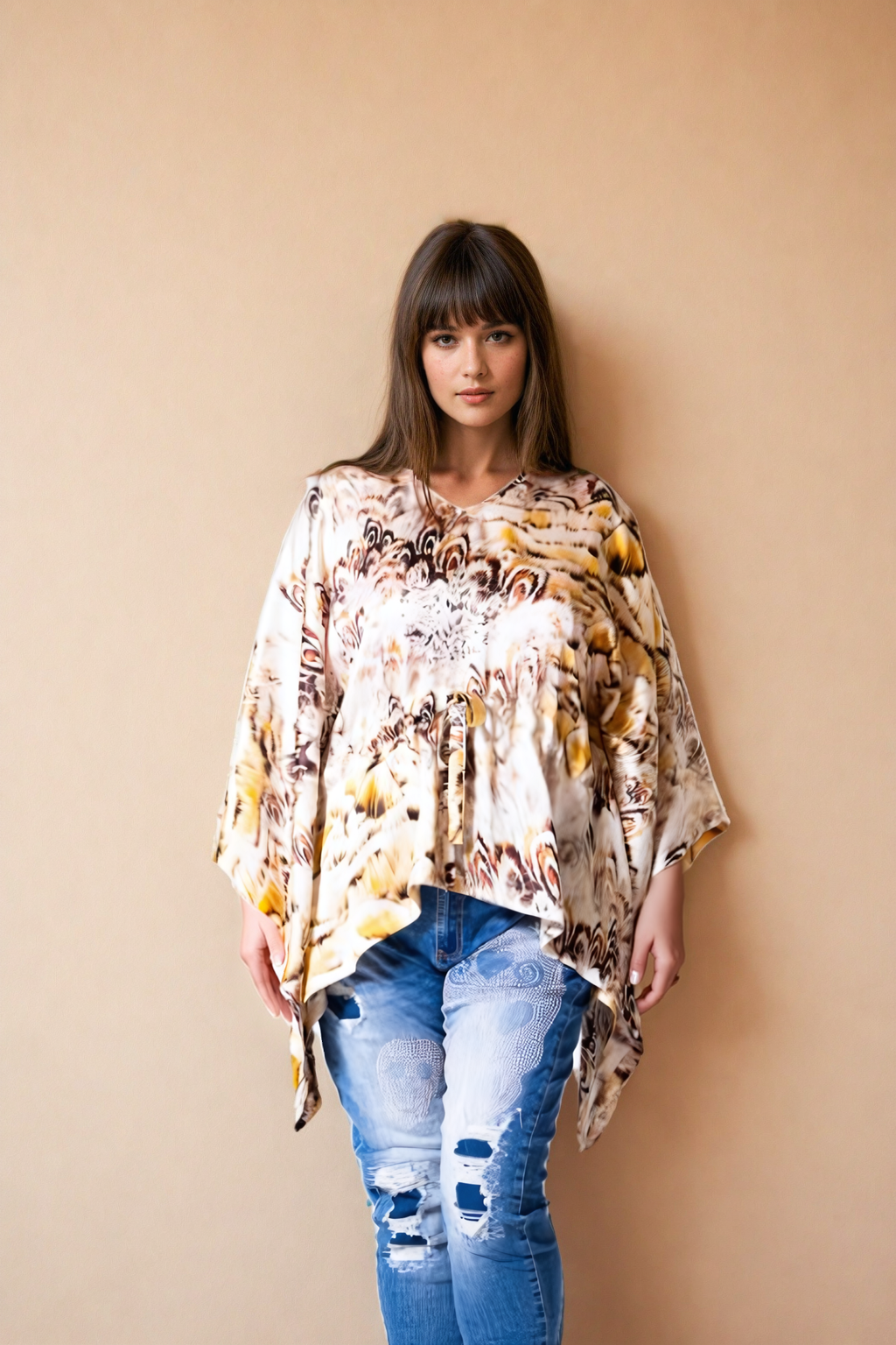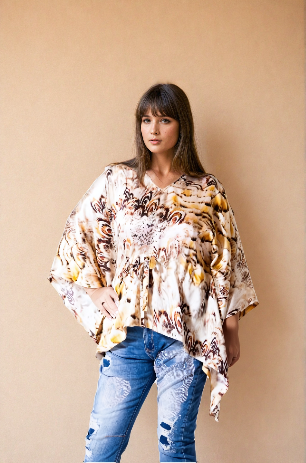 Dune Short Kaftan - Blouse delves into mesmerizing swirls of dessert mocha hues and animal accents. Made from luxuries 100% Italian Silk. The statement kimono sleeve adds a touch of drama to the blouse. Draped in a relaxed silhouette, this Dom Fiore Silk short Kaftan seamlessly blend with sophistication, making it an exquisite piece of any occasion.