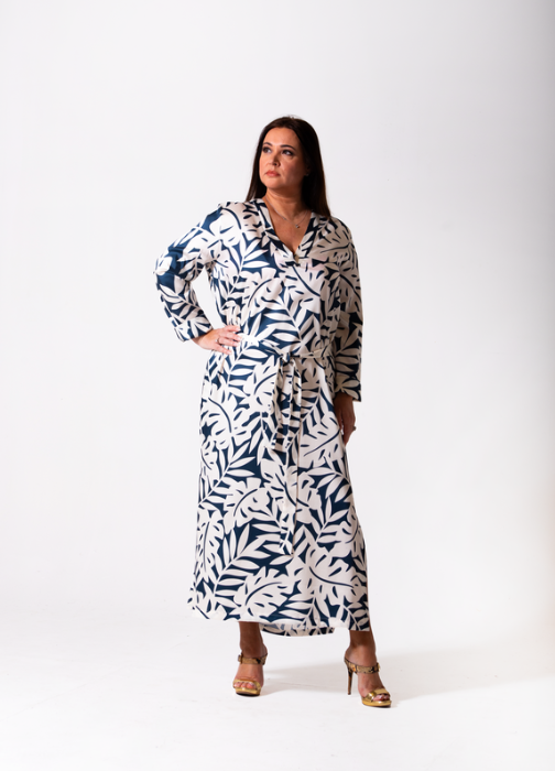 An essential for sunny vacations or pool parties. Futuristic print silk short kaftan with attached belt.