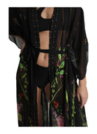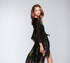 Create drama at every step, day-to-night, in our versatile sheer black robe that can be worn on its own lounging poolside, layered over our matching slip dress, or as a statement piece over your favorite pair of jeans. Lightweight, and airy, with 100% Swarovski detailed lapel. An essential for sunny vacations or pool parties. Black silk robe with floral print and crystal embellishment details. Swarovski crystals on collar & detachable belt.